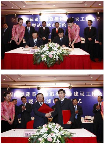 上面的照片是,中國十大城市 上海 杭州 蘇州 南京 大連 等城市的市長以及副市長級和商務部與農產品安全管理協會,簽署協議的場景照片場景